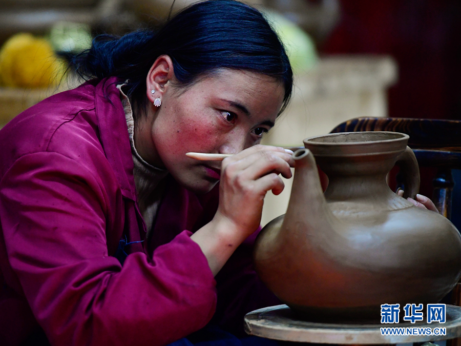 出身黑陶世家的謝格太就是當(dāng)?shù)赜忻暮谔占紟煛?014年,謝格太成立班瑪黑陶旅游產(chǎn)品開發(fā)有限責(zé)任公司,規(guī)?;a(chǎn)和銷售黑陶,并帶領(lǐng)學(xué)徒一起鉆研黑陶技藝,傳承和創(chuàng)新黑陶手工技藝文化。和泥、捏制、打磨、發(fā)酵、火燒、熏黑、拋光,經(jīng)過十幾道工序的磨煉,學(xué)徒們在謝格太的帶領(lǐng)下,不僅學(xué)到了技藝,傳承了技術(shù),每月還能拿到數(shù)千元的生活補助。