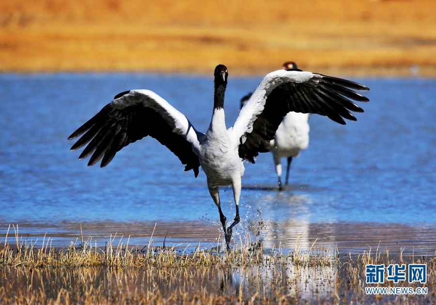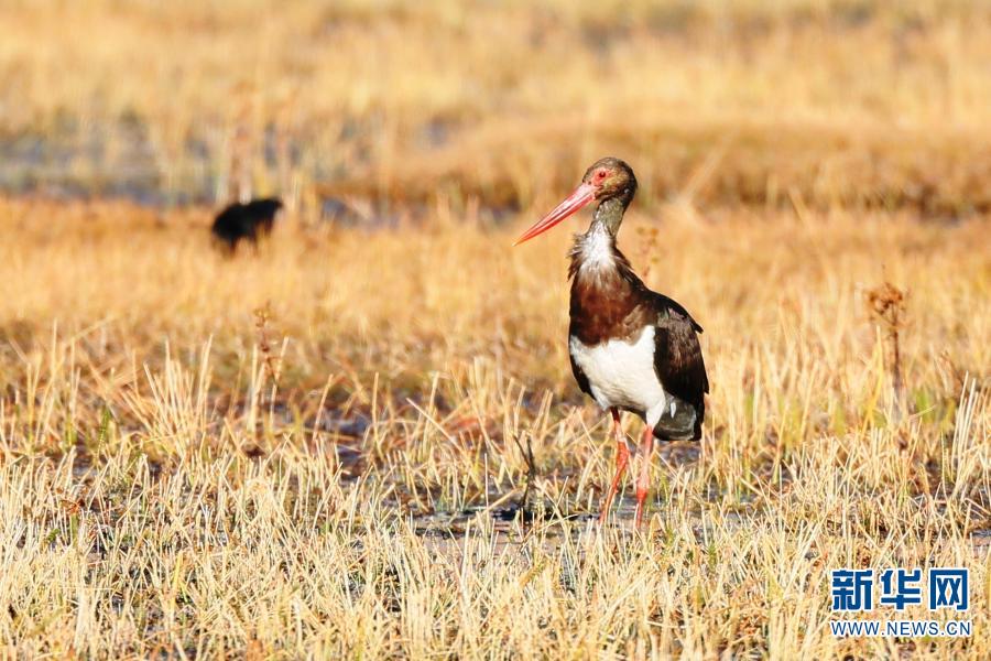 這是11月6日在云南省香格里拉市納帕海國際重要濕地拍攝的黑鸛。新華社 陳志明 攝