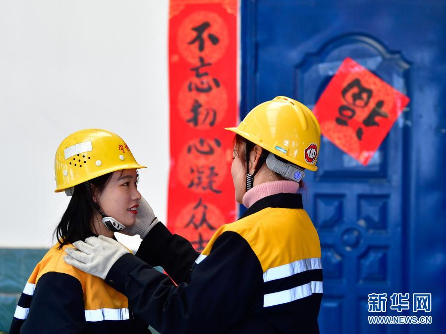 2月2日,在青藏鐵路公司西寧供電段哈爾蓋工區(qū),郭勝強(qiáng)(左)與羅露露在工作前互相檢查安全裝備。新華社記者 張龍 攝