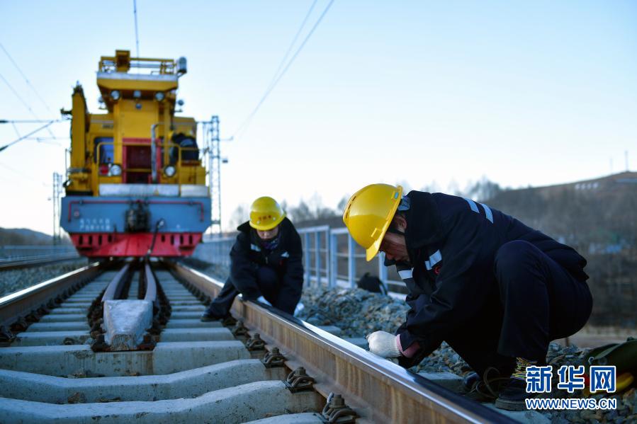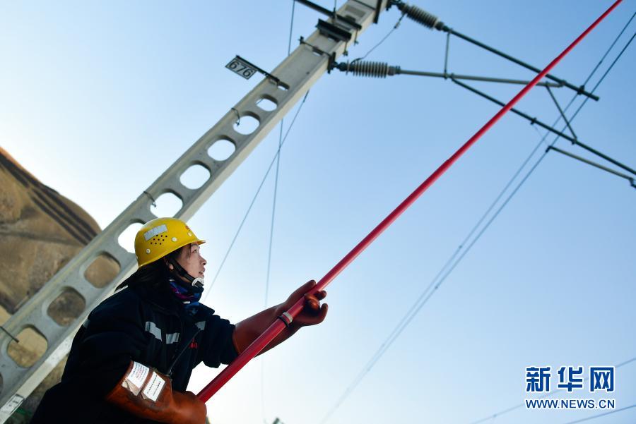 2月2日,在青藏鐵路公司西寧供電段哈爾蓋工區(qū)負(fù)責(zé)鐵路線上,羅露露在檢修螺絲。新華社記者 張龍 攝