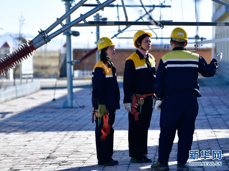 2月2日,在青藏鐵路公司西寧供電段哈爾蓋工區(qū),郭勝強(qiáng)(左)與羅露露(中)在聽老職工講解安全知識(shí)?!⌒氯A社記者 張龍 攝