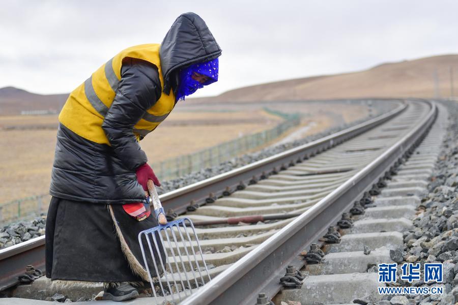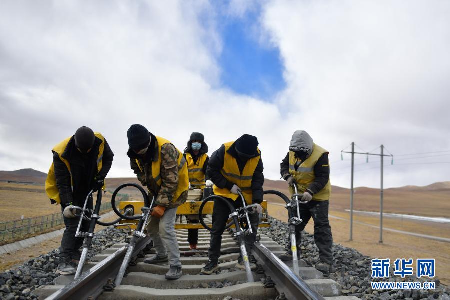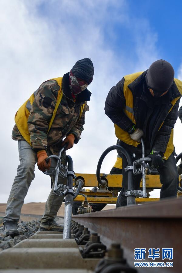 2月4日,養(yǎng)路工人在唐古拉山區(qū)養(yǎng)護(hù)青藏鐵路。新華社記者 張龍 攝