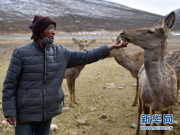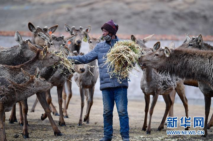 3月13日,甘德縣崗龍鄉(xiāng)恰不將村生態(tài)畜牧業(yè)專(zhuān)業(yè)合作社村民在鹿場(chǎng)喂鹿。新華社記者 張龍 攝