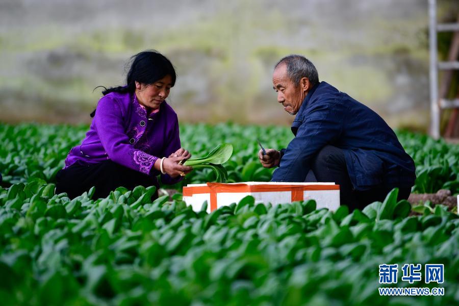 3月14日,在青海省果洛藏族自治州農(nóng)牧業(yè)生態(tài)科技示范園內,菜農(nóng)李華軍(右)與尼瑪措毛在采摘蔬菜。新華社記者 張龍 攝