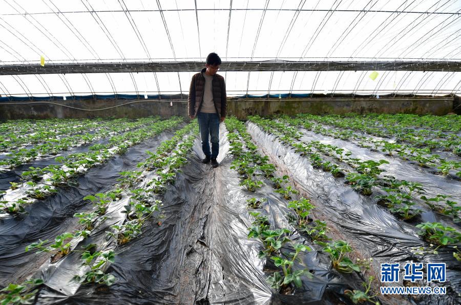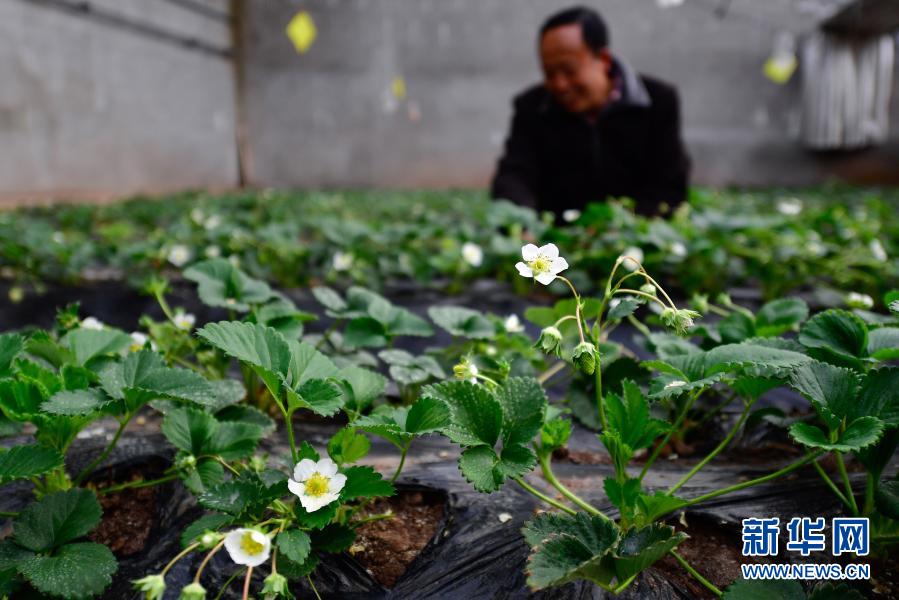 3月14日,在青海省果洛藏族自治州農(nóng)牧業(yè)生態(tài)科技示范園內,農(nóng)業(yè)技術員宋建東在查看草莓生長情況。新華社記者 張龍 攝