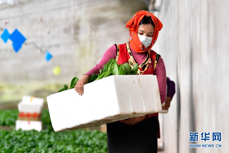 3月14日,在青海省果洛藏族自治州農(nóng)牧業(yè)生態(tài)科技示范園內,菜農(nóng)桑吉卓瑪在搬運蔬菜。新華社記者 張龍 攝