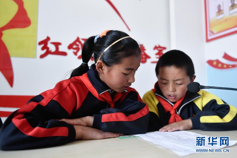 3月17日,在果洛藏族自治州甘德縣崗龍鄉(xiāng)寄宿制中心小學(xué),學(xué)生扎加(右)和崗尖卓瑪在紅領(lǐng)巾廣播室播音。新華社記者 張龍 攝