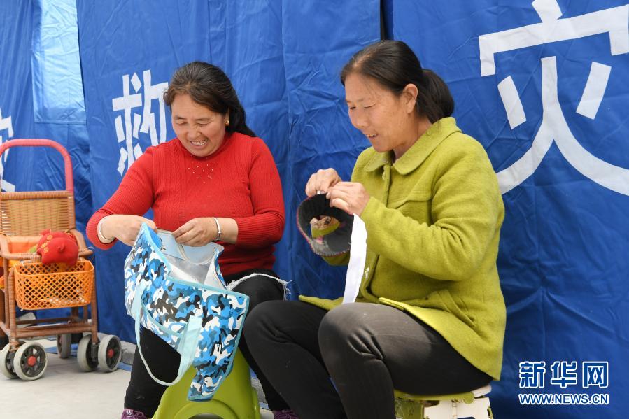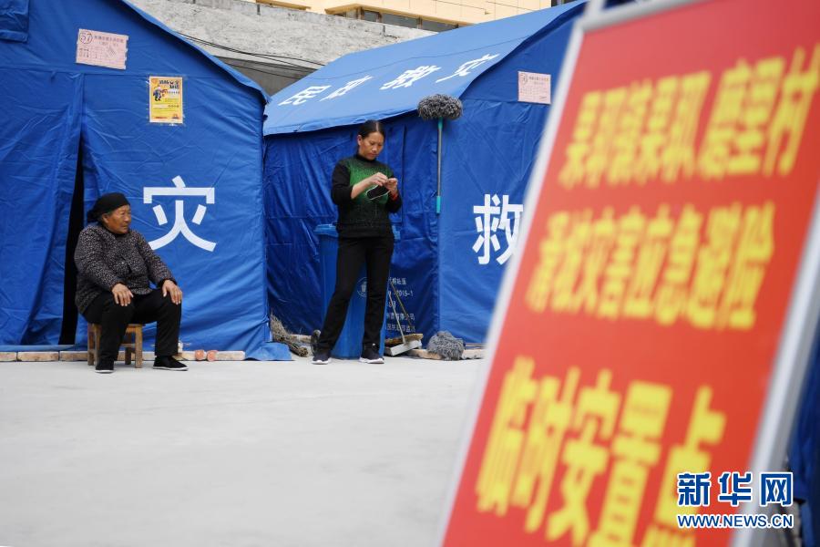 3月16日,在舟曲縣果耶鎮(zhèn)磨里村、果耶村滑坡災害應急避險臨時安置點,受災群眾在帳篷外做針線。新華社記者 范培珅 攝
