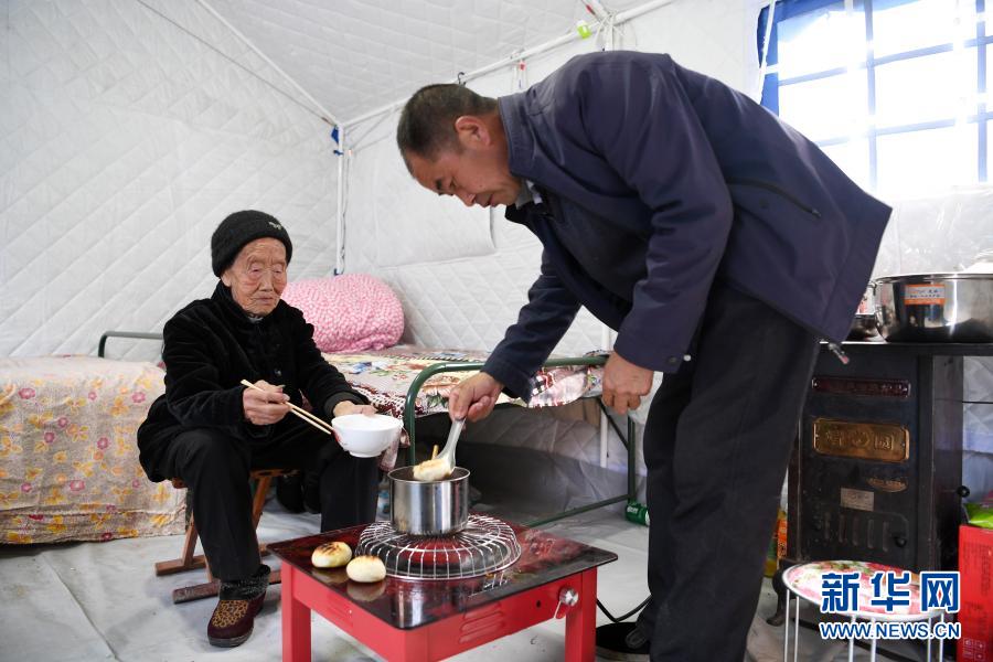3月16日,在舟曲縣果耶鎮(zhèn)磨里村、果耶村滑坡災害應急避險臨時安置點,受災群眾在帳篷內(nèi)吃飯。新華社記者 范培珅 攝