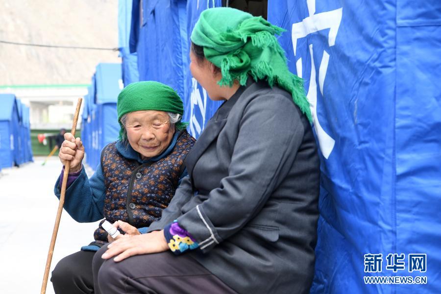3月16日,在舟曲縣果耶鎮(zhèn)磨里村、果耶村滑坡災害應急避險臨時安置點,受災群眾在帳篷外聊天。新華社記者 范培珅 攝