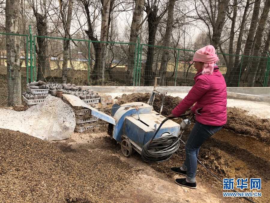 圖為廖玉梅正在攪拌羊肚菌培養(yǎng)基質。新華網 魚昊 攝