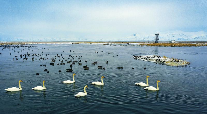 3月6日,若爾蓋濕地國(guó)家級(jí)自然保護(hù)區(qū)在花湖設(shè)立的高科技無(wú)人觀測(cè)塔(右后)正全天候觀察濕地鳥類的活動(dòng)。尹鋼 攝