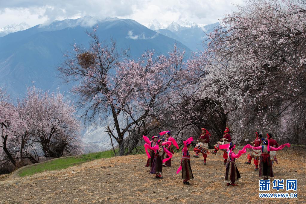 4月4日,在得榮縣徐龍鄉(xiāng)徐堆村,藏族群眾在桃花林下表演當?shù)馗栉琛X央彈唱。新華社記者 江宏景 攝