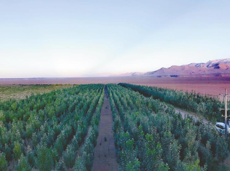 跟隨柴達(dá)木防沙治沙公司員工深一腳、淺一腳地走在治沙基地田埂上,一排排在田間地頭栽植的林木,為農(nóng)田和枸杞林構(gòu)成了一道道擋風(fēng)墻。雖然眼下林木尚在發(fā)芽,到了夏秋時節(jié)就是滿目蔥郁。