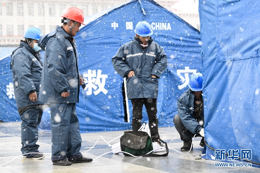 為了點(diǎn)亮災(zāi)區(qū)首夜,國家電網(wǎng)青海省電力公司組織143名應(yīng)急搶修人員,爭分奪秒為安置點(diǎn)通電。