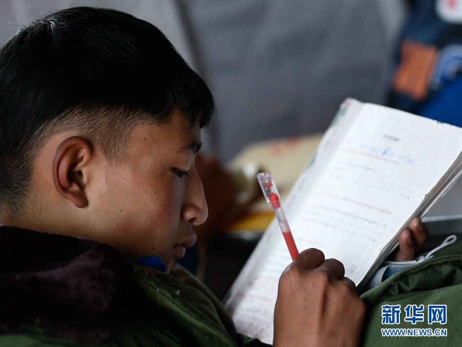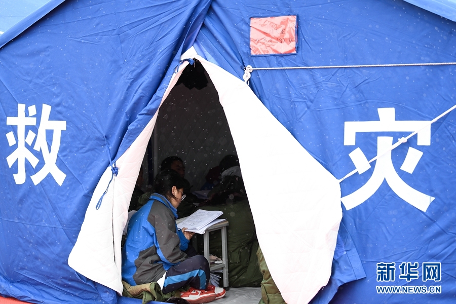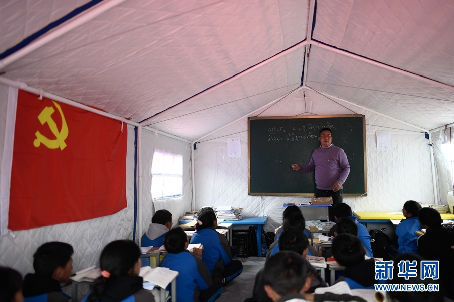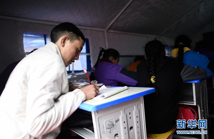 5月23日,瑪多縣民族寄宿制中學學生在帳篷教室上課。新華社記者 張龍 攝