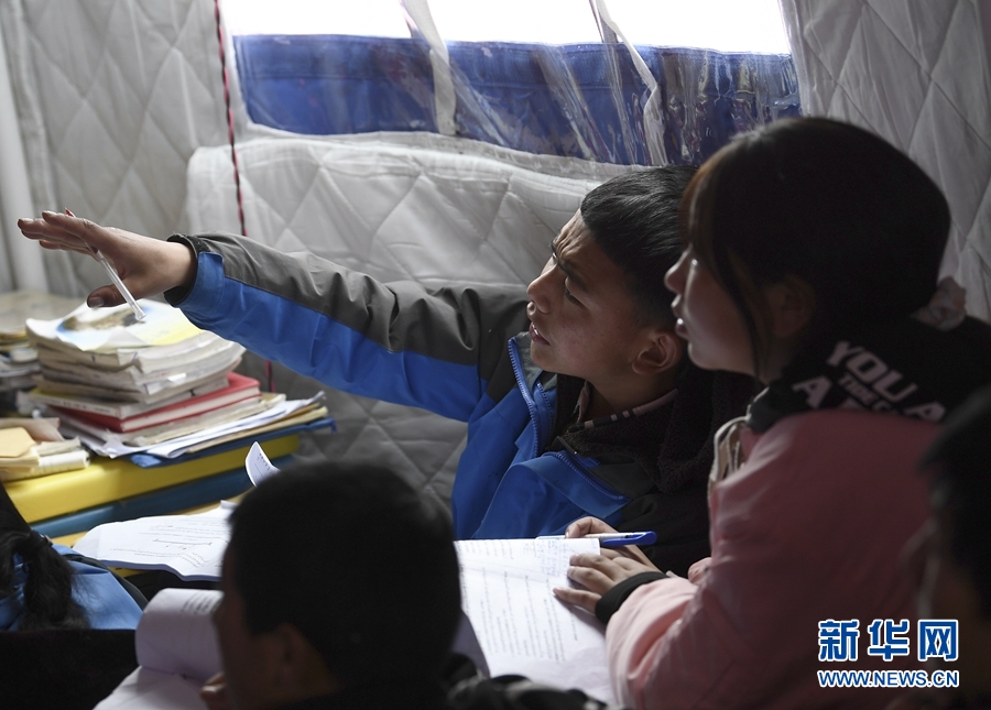 5月23日,瑪多縣民族寄宿制中學九年級老師李加才仁在課堂上輔導學生。新華社記者 張龍 攝
