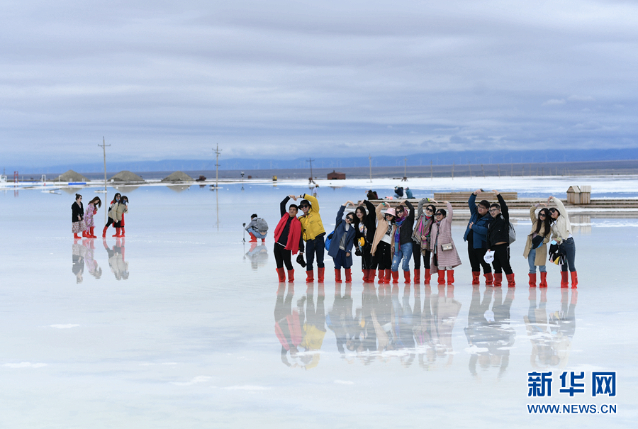 一群游客在茶卡鹽湖天空之鏡景區(qū)內(nèi)合影留念。新華網(wǎng) 潘彬彬 攝