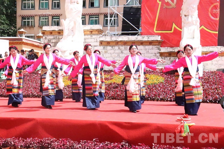 活動現(xiàn)場,黨旗國旗飄揚、哈達傳情,在一片歡騰的海洋里,大家載歌載舞齊唱光輝歲月,放聲歌頌幸福美好生活,盡情抒發(fā)高城兒女的愛黨愛國情懷。歌曲《翻身農(nóng)奴把歌唱》《草原上升起不落的太陽》,穿插吉祥老人頌詞和舞蹈。表達高原兒女在中國共產(chǎn)黨的領導下,翻身獲得解放,掌握了自己的命運。短短幾十年的發(fā)展過程,涉藏州縣迎來騰飛,經(jīng)濟社會發(fā)生了翻天覆地的變化,與祖國同步實現(xiàn)全面小康。