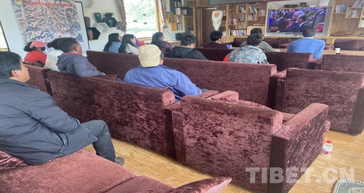 圖為四川甘孜甲洼鎮(zhèn)黨員一起觀看中國共產(chǎn)黨成立100周年大會直播