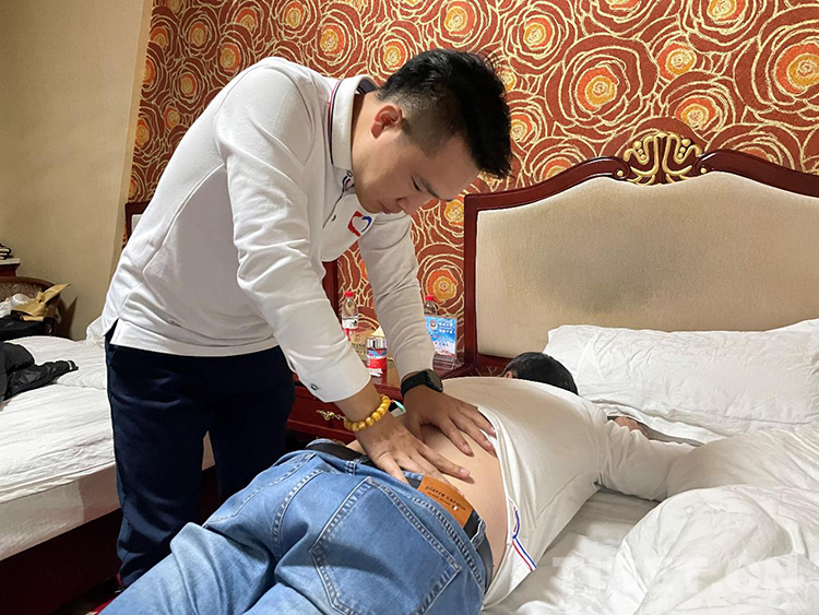 圖為常有才為團隊成員進行針灸治療