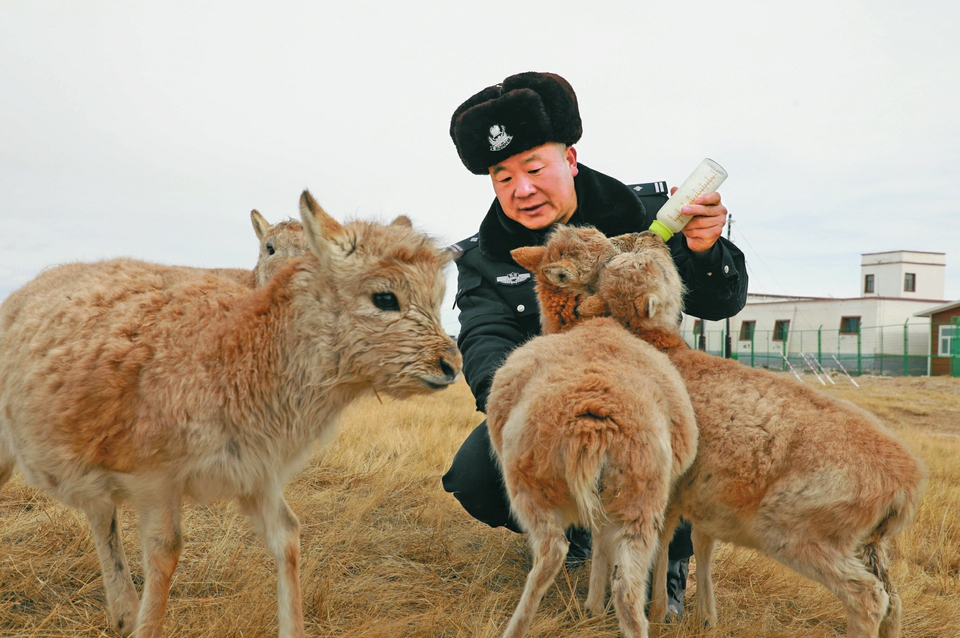索南達(dá)杰保護站站長趙新錄在給藏羚羊幼仔喂奶。新華社發(fā)