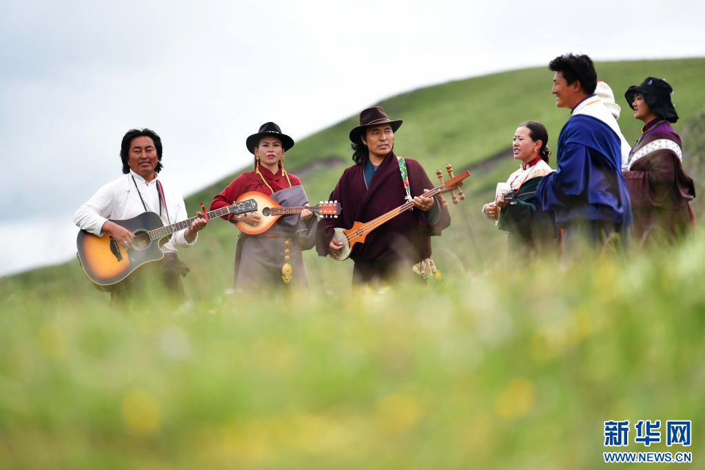 夏日的草原“流行樂” 格薩爾彈唱藝人在瑪曲草原上彈唱格薩爾(7月14日攝)。新華社記者 杜哲宇 攝