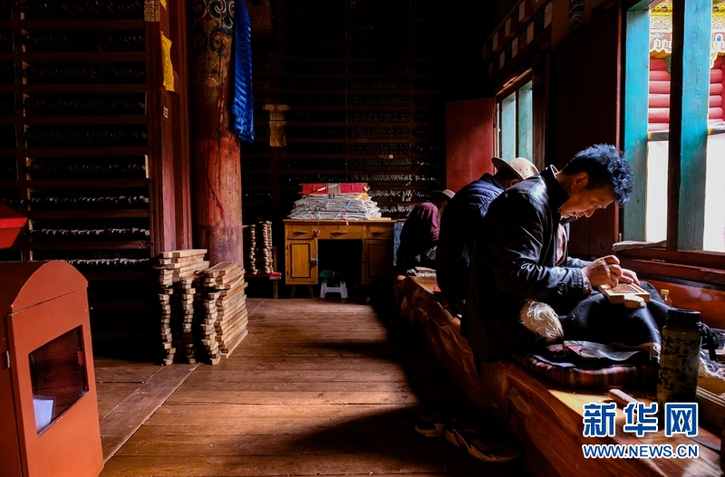 7月20日,四川德格,印經(jīng)院藏族雕版印刷非遺傳承人校對木刻版。中新社記者 劉忠俊 攝