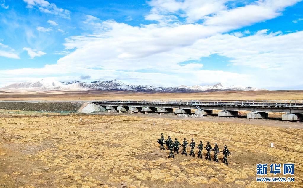 武警青海總隊(duì)執(zhí)勤支隊(duì)執(zhí)勤七中隊(duì)官兵在青藏鐵路沿線巡邏(5月21日攝)。新華社 楊浩 攝