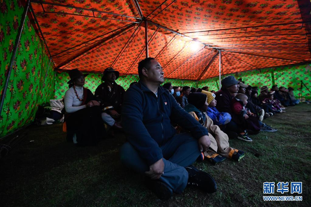 8月3日,在瑪沁縣當(dāng)洛鄉(xiāng)貢龍村的夏季草場上,牧民群眾在看電影。新華社記者 張龍 攝