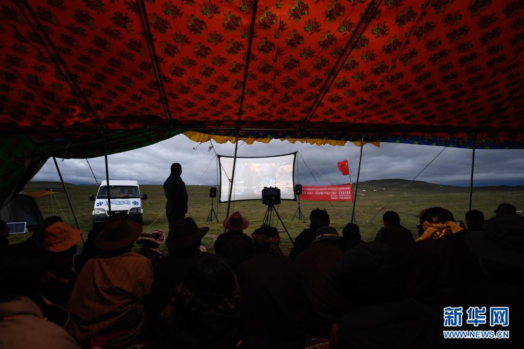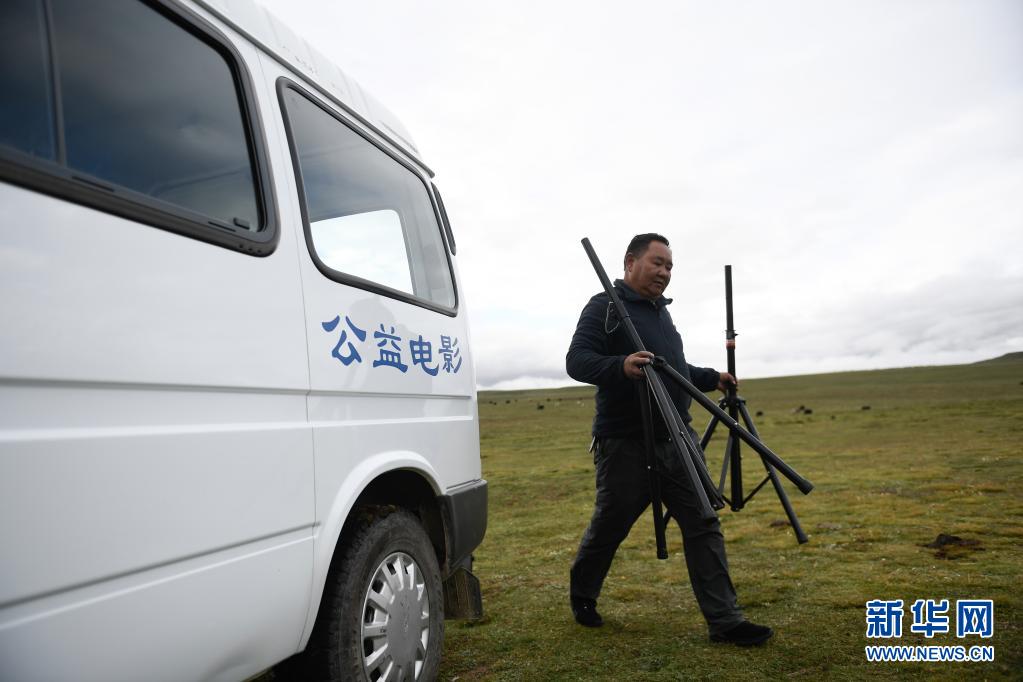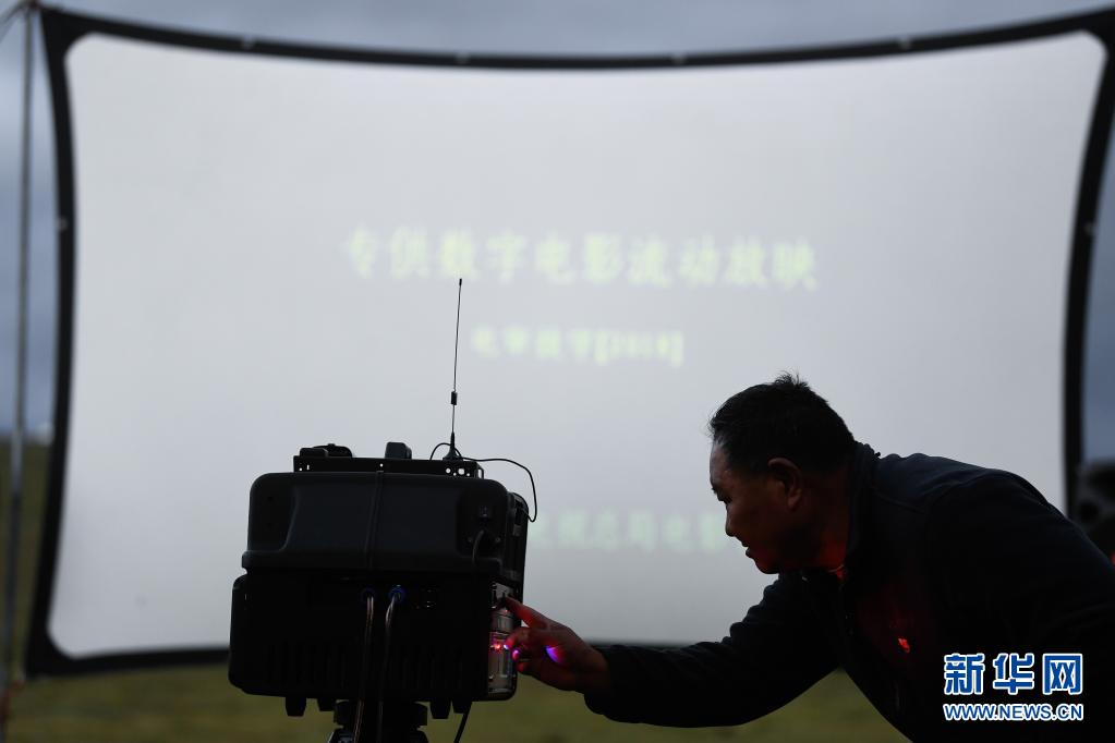 8月3日,在瑪沁縣當(dāng)洛鄉(xiāng)貢龍村的夏季草場上,南拉才讓為牧民放電影。新華社記者 張龍 攝