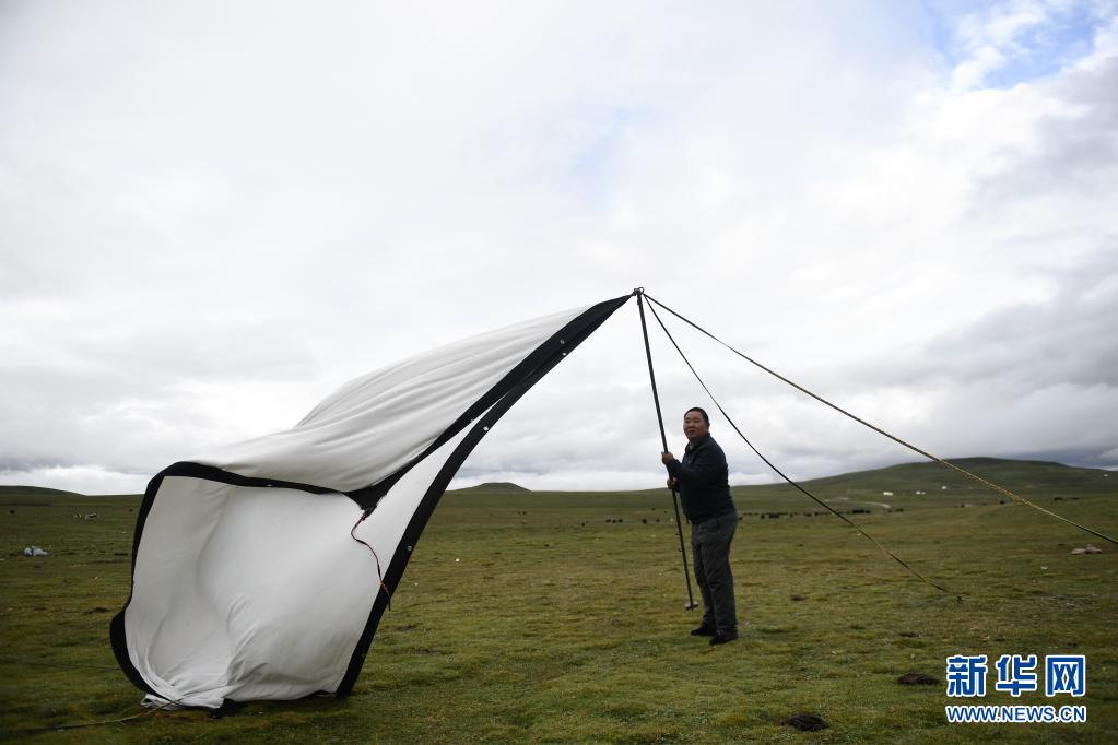 8月3日,在瑪沁縣當(dāng)洛鄉(xiāng)貢龍村的夏季草場上,南拉才讓在搭設(shè)電影幕布。新華社記者 李占軼 攝