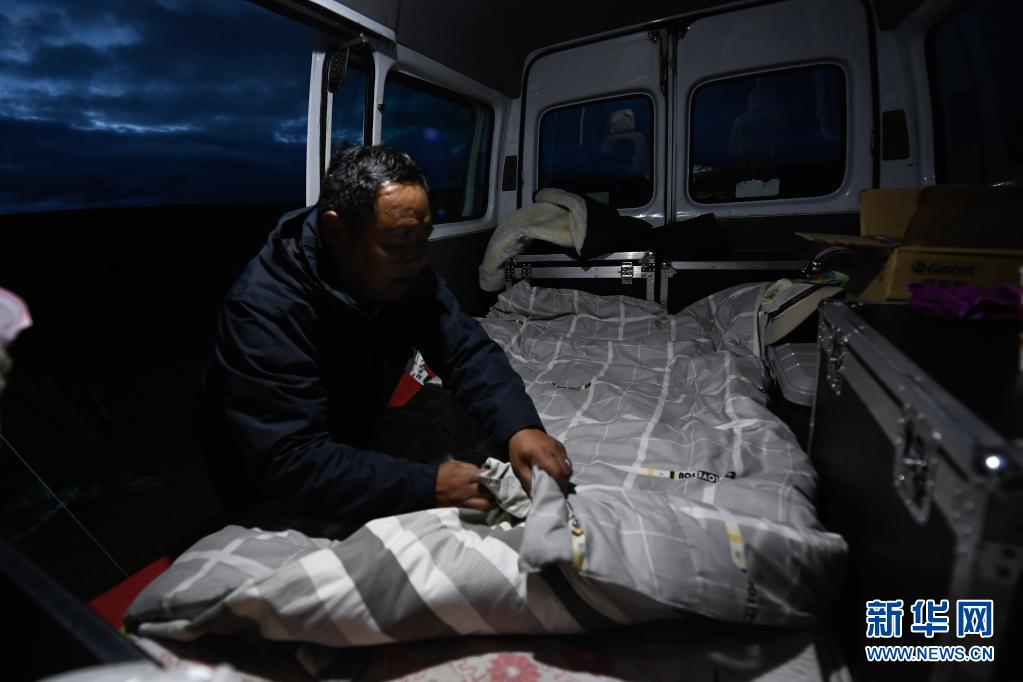 8月3日,在瑪沁縣當(dāng)洛鄉(xiāng)貢龍村的夏季草場上,南拉才讓在放映車中整理床鋪。每次到草原上放電影,南拉才讓都睡在車?yán)铩P氯A社記者 張龍 攝