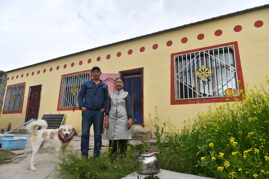 在青海省玉樹藏族自治州治多縣治渠鄉(xiāng)同卡村,村民昂文西讓和妻子布沙措江卓瑪站在易地搬遷的新家院子里合影(2019年9月12日攝)。新華社記者 孫瑞博 攝