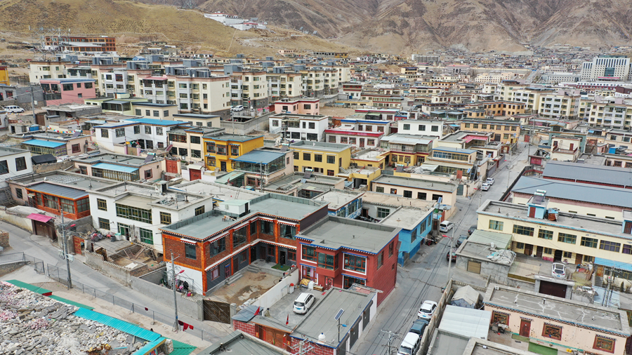 這是3月10日拍攝的重建后的玉樹市扎西大同村一角(無人機(jī)照片)。新華社記者 張宏祥 攝