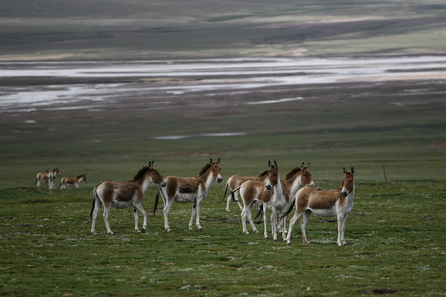 7月25日,在三江源地區(qū),一群藏野驢在草原上活動。新華社記者 張龍 攝