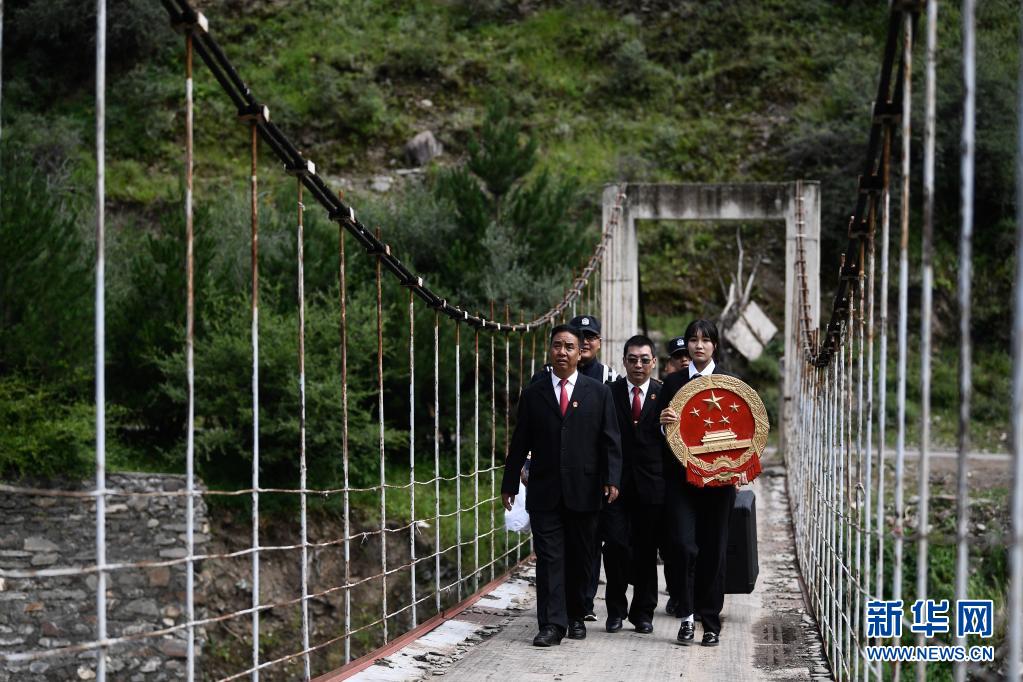 8月7日,班瑪縣人民法院工作人員在林區(qū)懸掛國(guó)徽,布設(shè)巡回法庭。新華社記者 張龍 攝