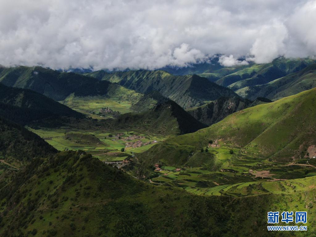 8月7日在青海省果洛藏族自治州班瑪縣境內(nèi)拍攝的村莊景色(無人機(jī)照片)。新華社記者 張龍 攝