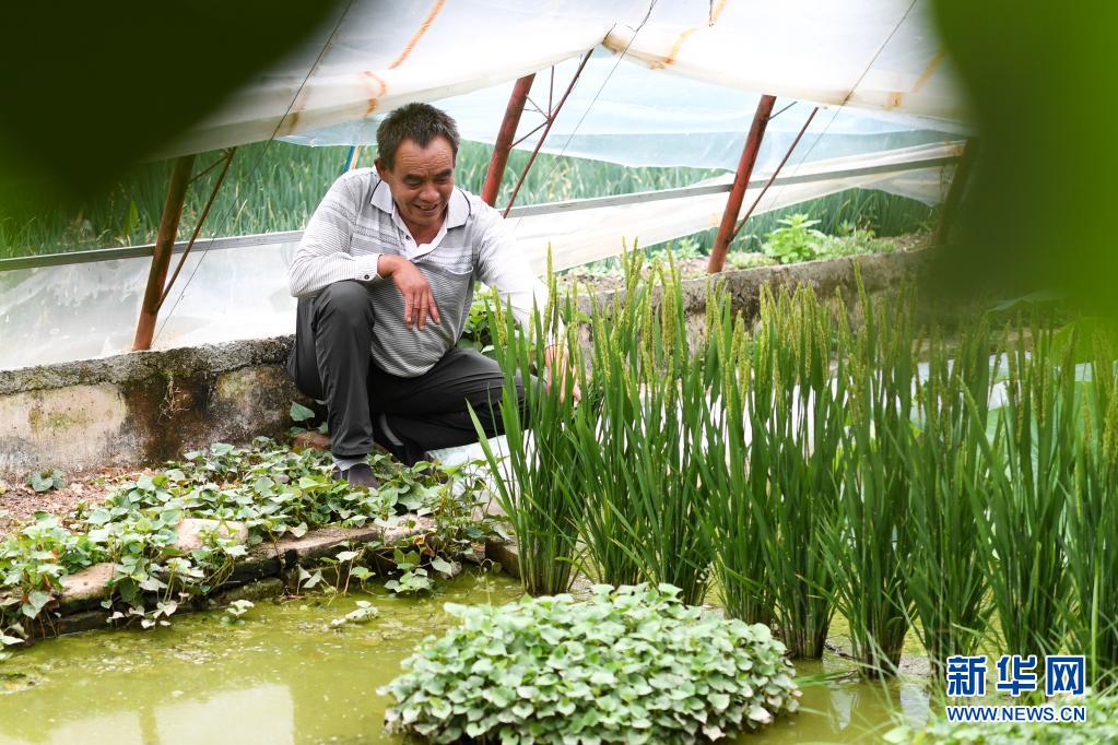 8月5日,魏金明在玉樹市結古鎮(zhèn)新寨村的蔬菜基地查看水稻長勢。新華社記者 吳剛 攝