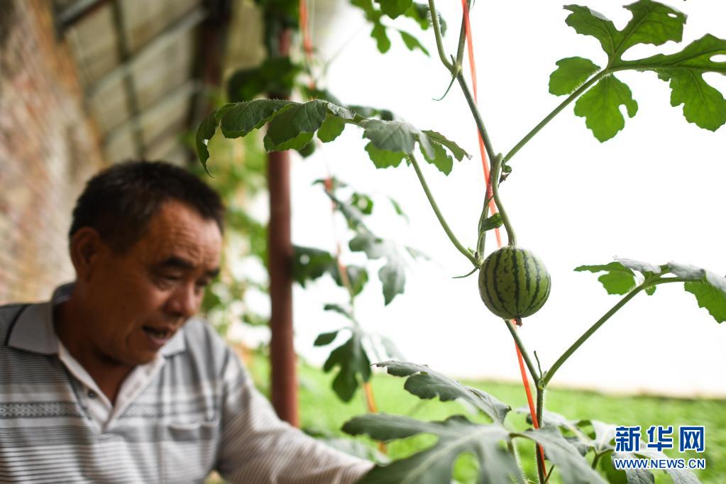 8月5日,魏金明在玉樹市結古鎮(zhèn)新寨村的蔬菜基地查看西瓜長勢。新華社記者 吳剛 攝