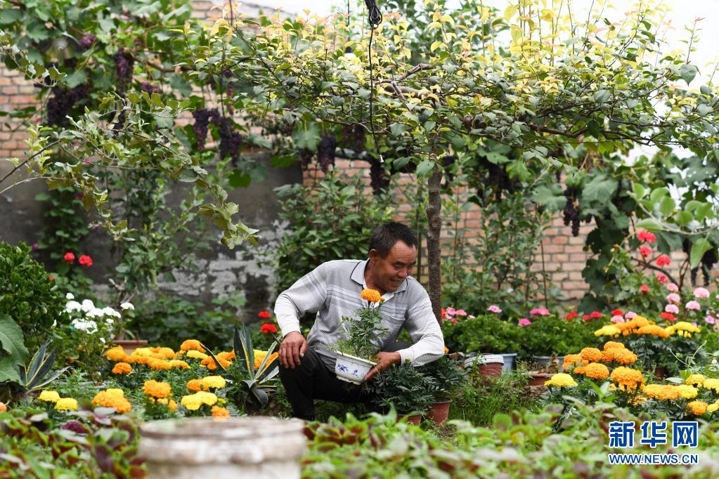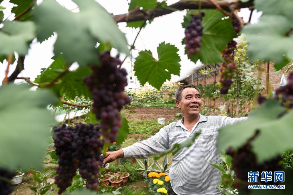 8月5日,魏金明在玉樹市結古鎮(zhèn)新寨村的蔬菜基地整理葡萄架。新華社記者 吳剛 攝