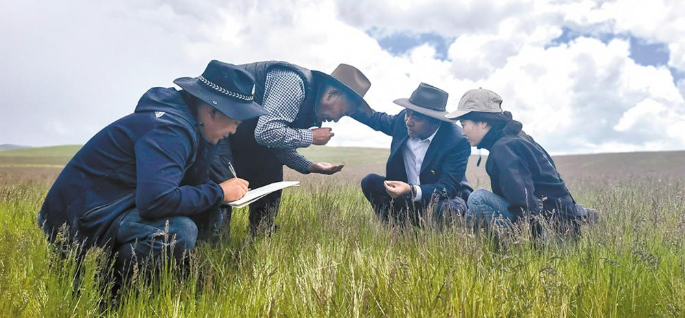 羅日蓋(左二)在達(dá)日縣特合土鄉(xiāng)夏曲村的萬畝草種基地查看草的長(zhǎng)勢(shì)。咸文靜 攝