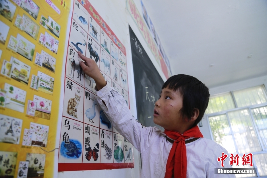 一名學(xué)生在看圖識字。中新社記者 馬銘言 攝