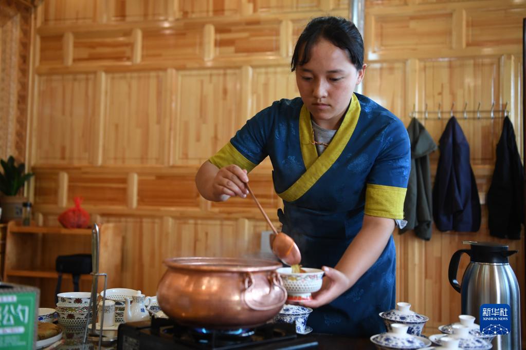 甘肅甘南卓尼縣木耳鎮(zhèn)力賽村村民拉姆卓瑪在自家的農家樂里為客人盛湯(9月11日攝)。新華社記者 陳斌 攝
