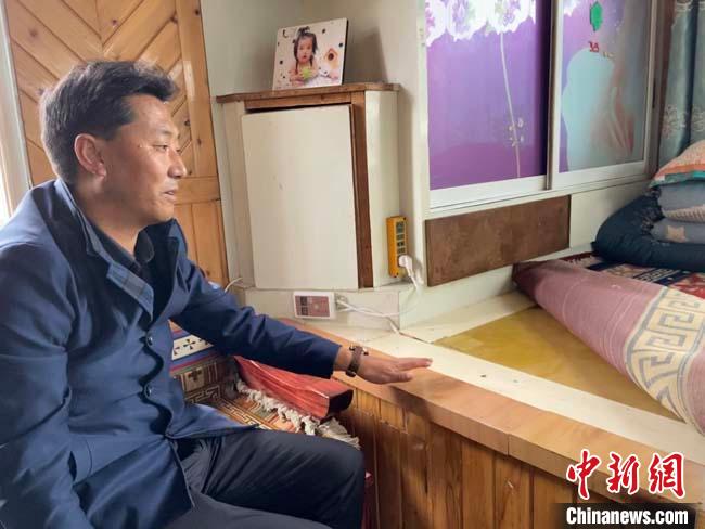 圖為合作市堅木克爾街道黨工委書記阿黑介紹村民家的碳纖維電熱炕板。 宋子昕 攝