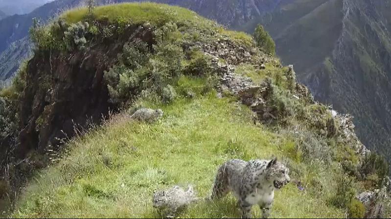 據(jù)了解,雪豹出現(xiàn)的地方距離曲麻萊縣城大概80公里左右,視頻中,雪豹媽媽先是出現(xiàn)在了鏡頭前面,過了一會之后,兩只小雪豹從草叢中“躡手躡腳”跑了出來,樣子十分可愛,隨后在雪豹媽媽的帶領下,三只雪豹消失在了鏡頭前。當?shù)厣鷳B(tài)環(huán)境部門工作人員告訴記者,除了這次紅外相機拍攝到雪豹蹤跡,在前段時間,距離三只雪豹出現(xiàn)三十多公里的地方,還拍攝到了另一只在夜間活動的雪豹,畫面中這只雪豹嘴里叼著獵物,背對著走過紅外相機鏡頭。