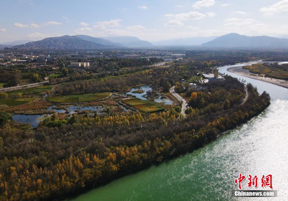 10月16日,航拍青海省海南藏族自治州貴德縣黃河岸邊的蘆花灣水生態(tài)公園。(無人機照片) 中新社記者 馬銘言 攝