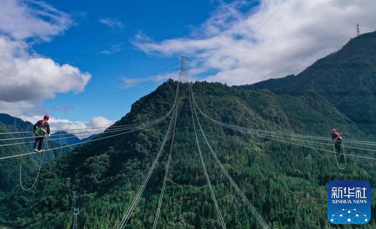 10月18日,在四川省雅安市天全縣喇叭河鎮(zhèn),技術(shù)人員在導(dǎo)線上進(jìn)行質(zhì)檢工作(無人機(jī)照片)。新華社記者 王曦 攝