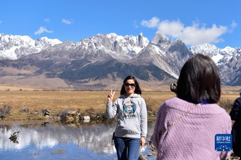 游客在四川甘孜巴塘縣措普溝景區(qū)內(nèi)拍照留念(10月24日攝)。新華社記者 胥冰潔 攝
