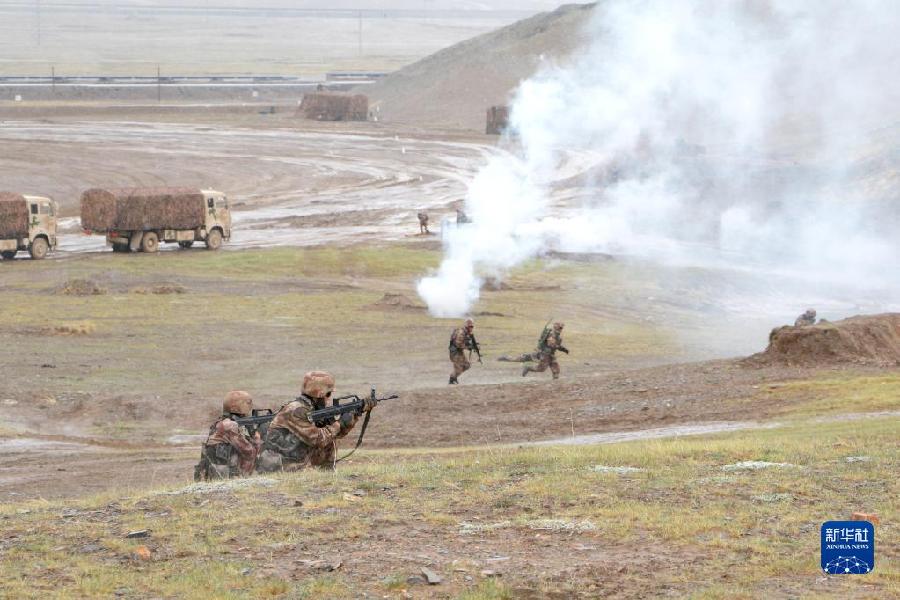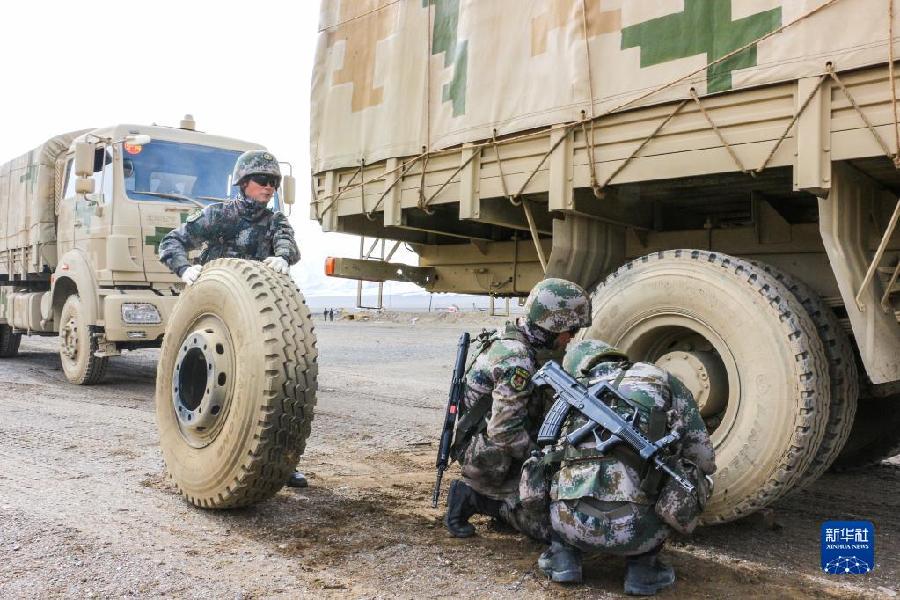 聯(lián)勤保障部隊汽車運輸某團(tuán)一營一連參加高原駐訓(xùn)時,在行車途中組織官兵進(jìn)行防衛(wèi)演練(2020年6月16日攝)。新華社發(fā)